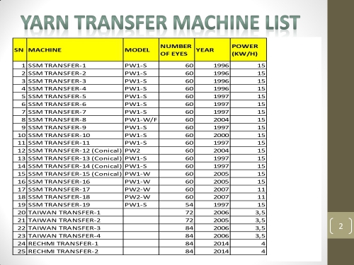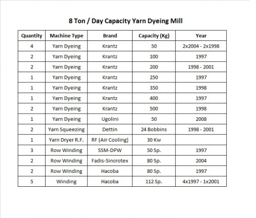 | BB-222 | KOMPLE İPLİK BOYAMA TESİSİ | 1997-2004 | 10 TON/GÜN | KRANTZ İPLİK BOYAMALAR, DETTİN SIKMA, STALAM KURUTMA VS. AYRINTILI MAKİNA LİSTESİ ======> | ![]() |